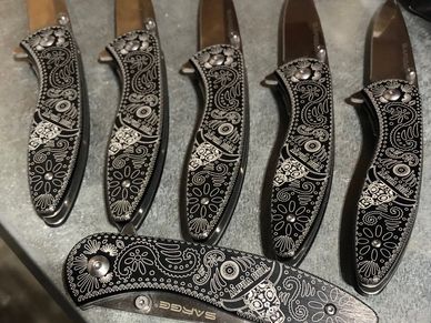 Engraving and cutting of natural materials including leather, wood, HD foam, acrylic, and lamacoid, as well as, coated tumblers.